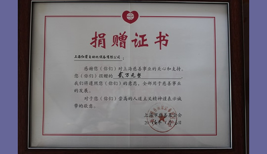 2014年,上海紅箭自動(dòng)化設(shè)備有限公司為上海市慈善基金會(huì)捐款 2014